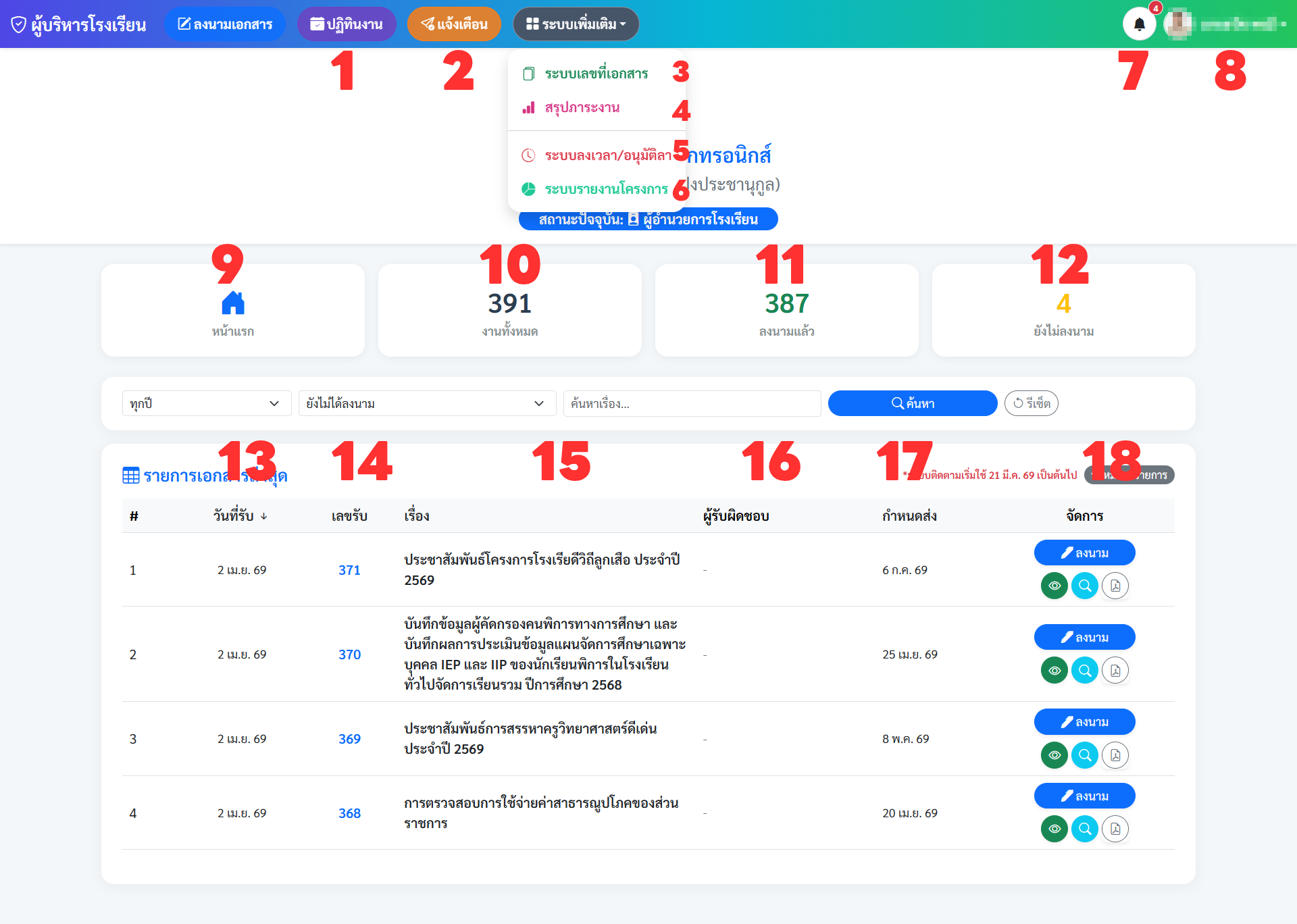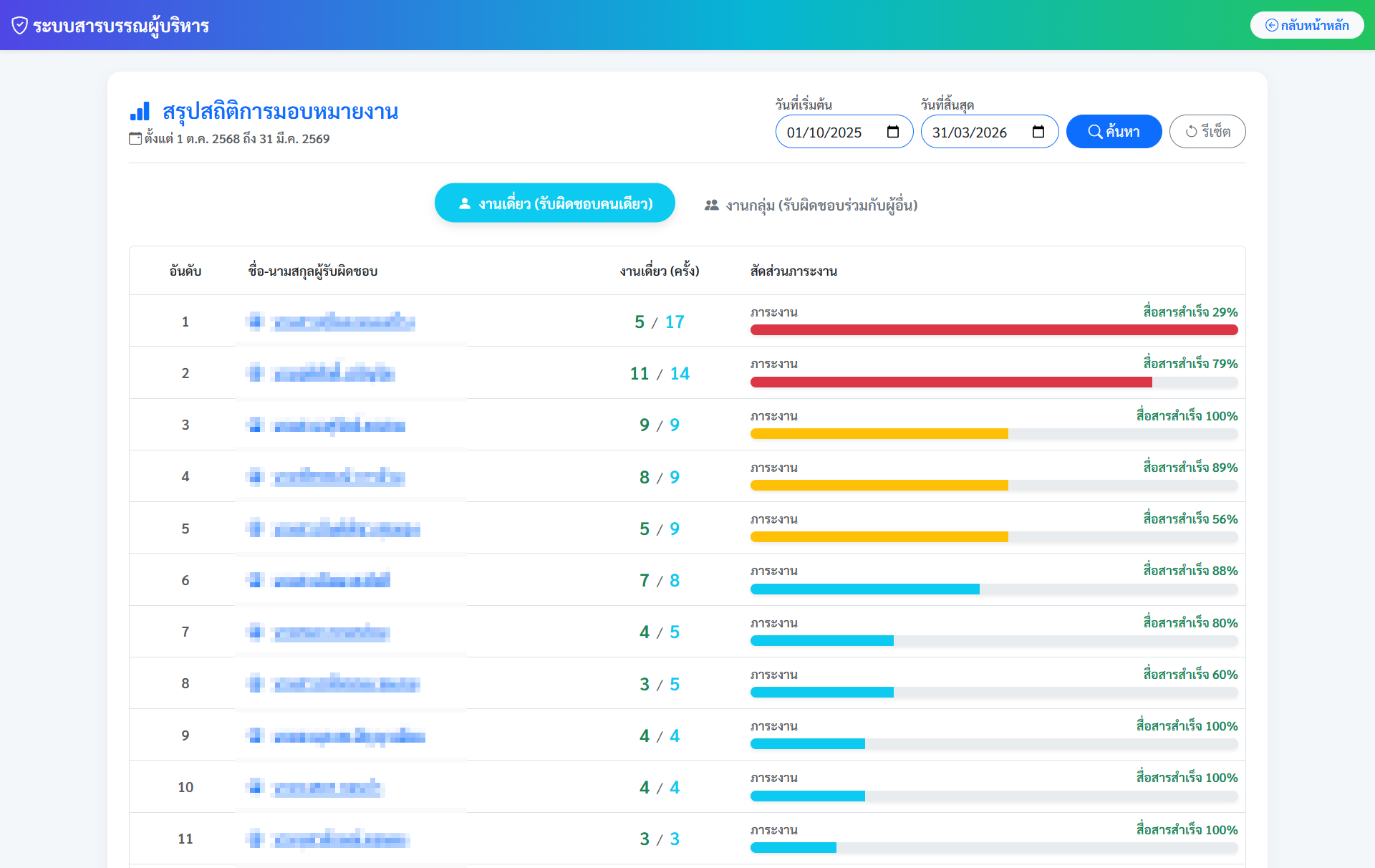 แสดงภาพรวมปริมาณงานที่มอบหมายให้บุคลากรแต่ละท่าน ช่วยให้ ผอ. สามารถติดตามความคืบหน้า ประเมินความสมดุลของภาระงาน และบริหารจัดการทรัพยากรบุคคลได้อย่างมีประสิทธิภาพ ทั้งงานเดี่ยวและงานกลุ่มได้อย่างครอบคลุม