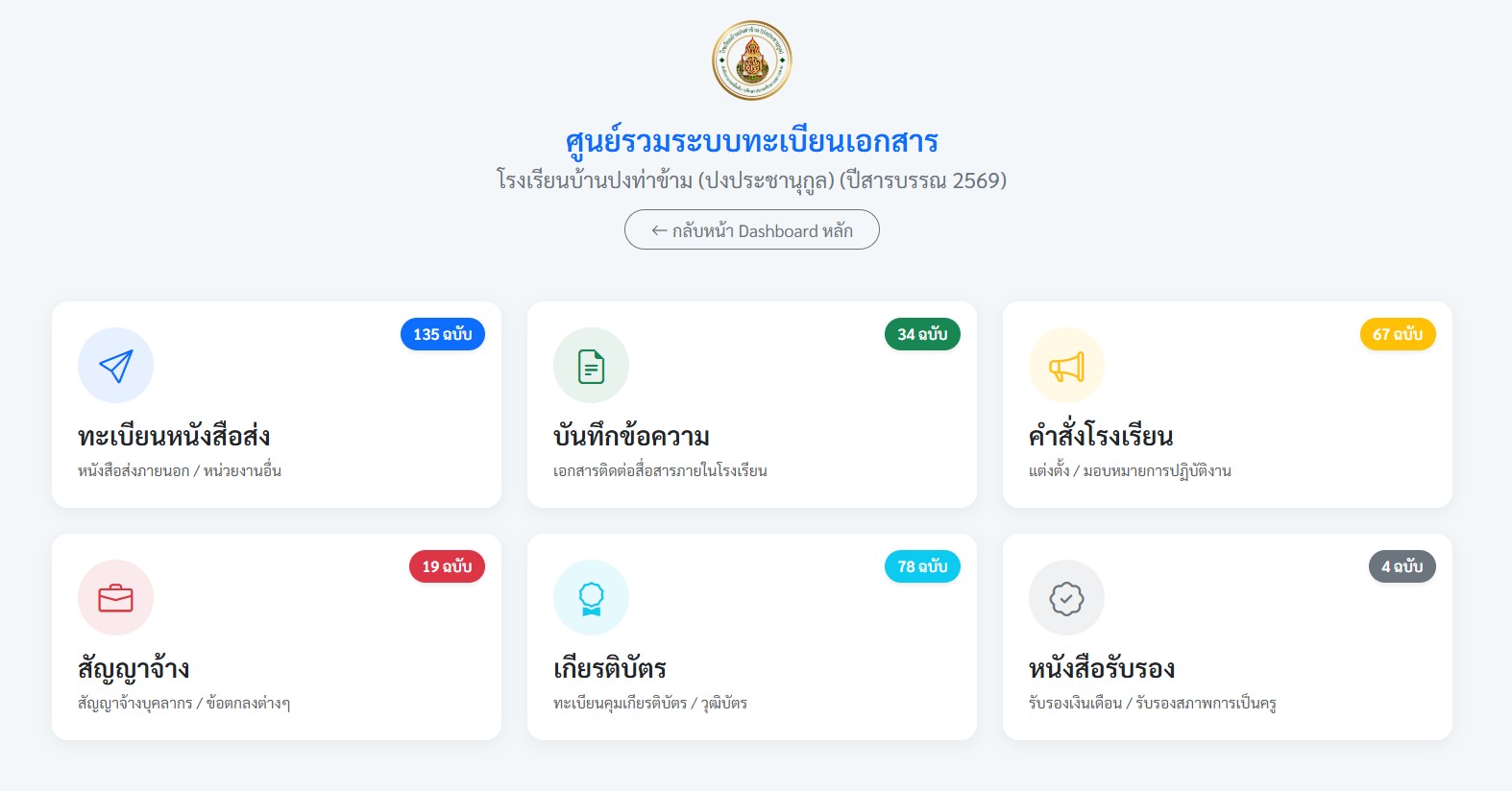 - หมดปัญหาการจดเลขซ้ำซ้อนหรือเลขข้าม! ระบบจะทำการรันเลขที่เอกสารให้อัตโนมัติตามประเภทของหนังสือ (เช่น ทะเบียนหนังสือรับ, แจ้งเวียน) ทันทีที่มีการบันทึกข้อมูล พร้อมจัดเรียงอย่างเป็นระเบียบ