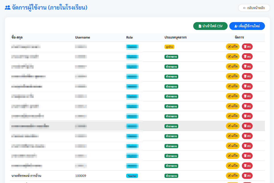 - เพิ่ม ลบ แก้ไข ข้อมูลผู้ใช้งาน รหัสผ่าน ประเภทผู้ใช้งาน โดยสามารถเพิ่มทั้งแบบทีละคน หรือ เพิ่มจำนวนมากโดยโหลด template Excel มากรอกข้อมูล และอัพโหลดไปยังระบบได้
