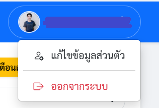 มุมขวามือด้านบน คลิกเลือกแก้ไขข้อมูลส่วนตัว (ชื่อ สกุล รูปภาพ ลายเซ็น) หรือ ออกจากระบบ