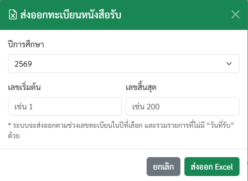 เลือกปีการศึกษา - เลือกเลขที่เริ่มต้น - เลือกเลขที่สิ้นสด - ส่งออกเป็น excel