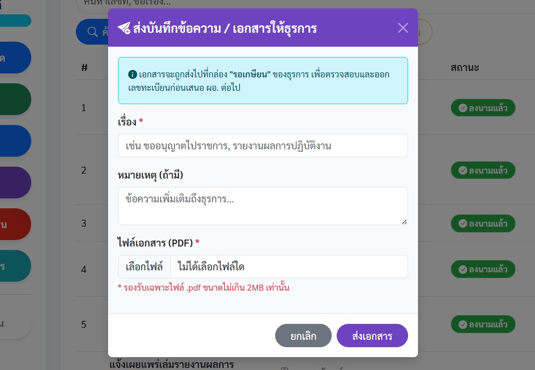 - เมื่อส่งแล้วจะแจ้งเตือนไปยังระบบของธุรการ