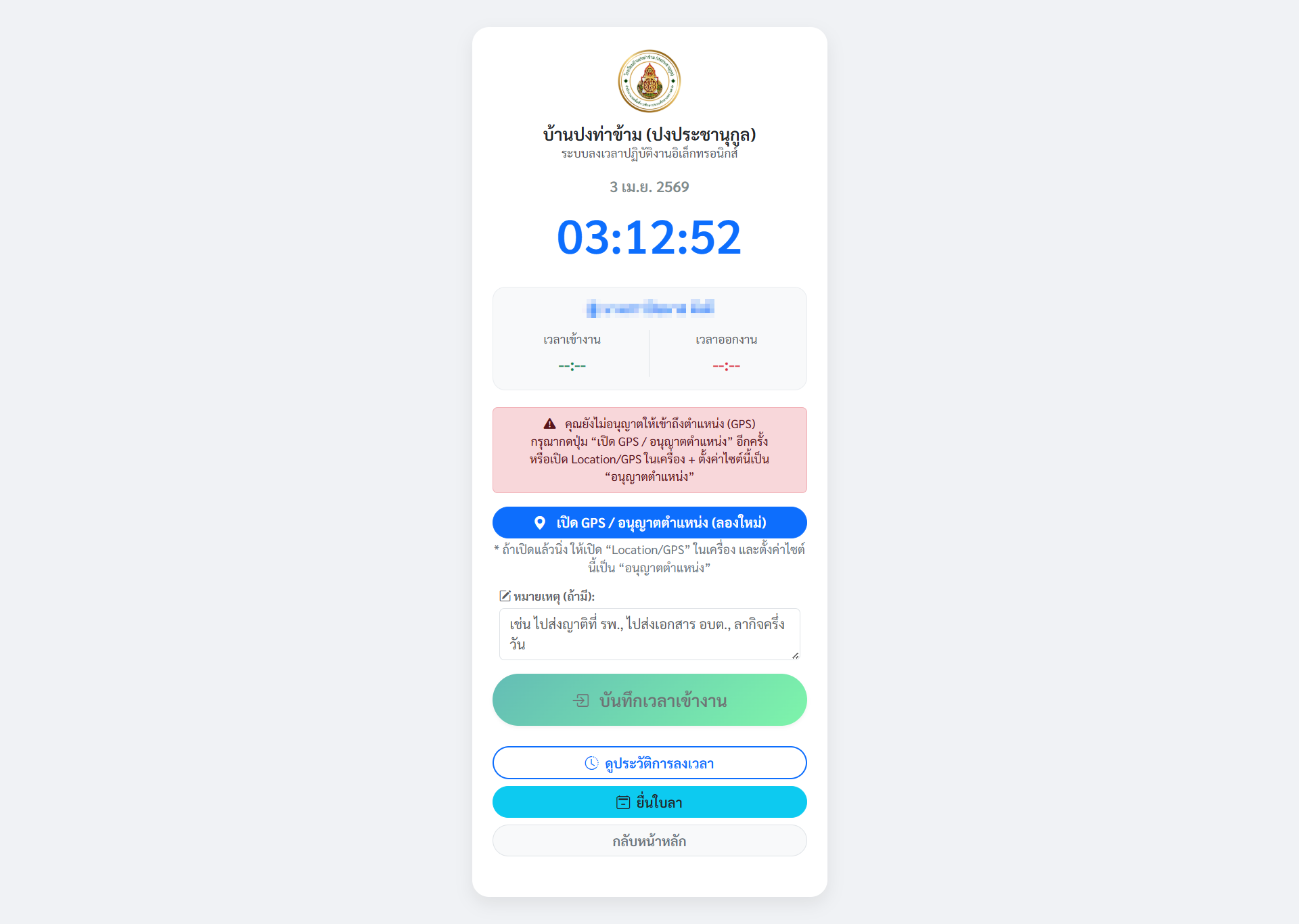 - ตรวจสอบทุกอย่างให้ถูกต้องแล้วกด บัดทึกเวลาเข้างาน/บันทึกเวลาออกงาน